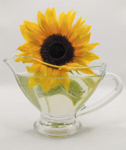 Olej słonecznikowy jest  źródłem witaminy E, zwanej witaminą młodości. Dzięki zawartości tej witaminy, a także dużych ilości przeciwutleniaczy, olej słonecznikowy jest z powodzeniem wykorzystywany w kosmetyce. Występuje przede wszystkim w kosmetykach zapobiegających starzeniu się skóry i zapewniających jej młody wygląd, można go odnaleźć również w składzie kosmetyków przeznaczonych do pielęgnacji cery problematycznej. Wzmacnia bariery naskórkowe, doskonale zmiękcza i wygładza skórę. Ma działanie przeciwrodnikowe, przeciwzapalne i normalizujące. Doskonale nadaje się również do cery przetłuszczającej się, ponieważ reguluje wydzielanie sebum.
